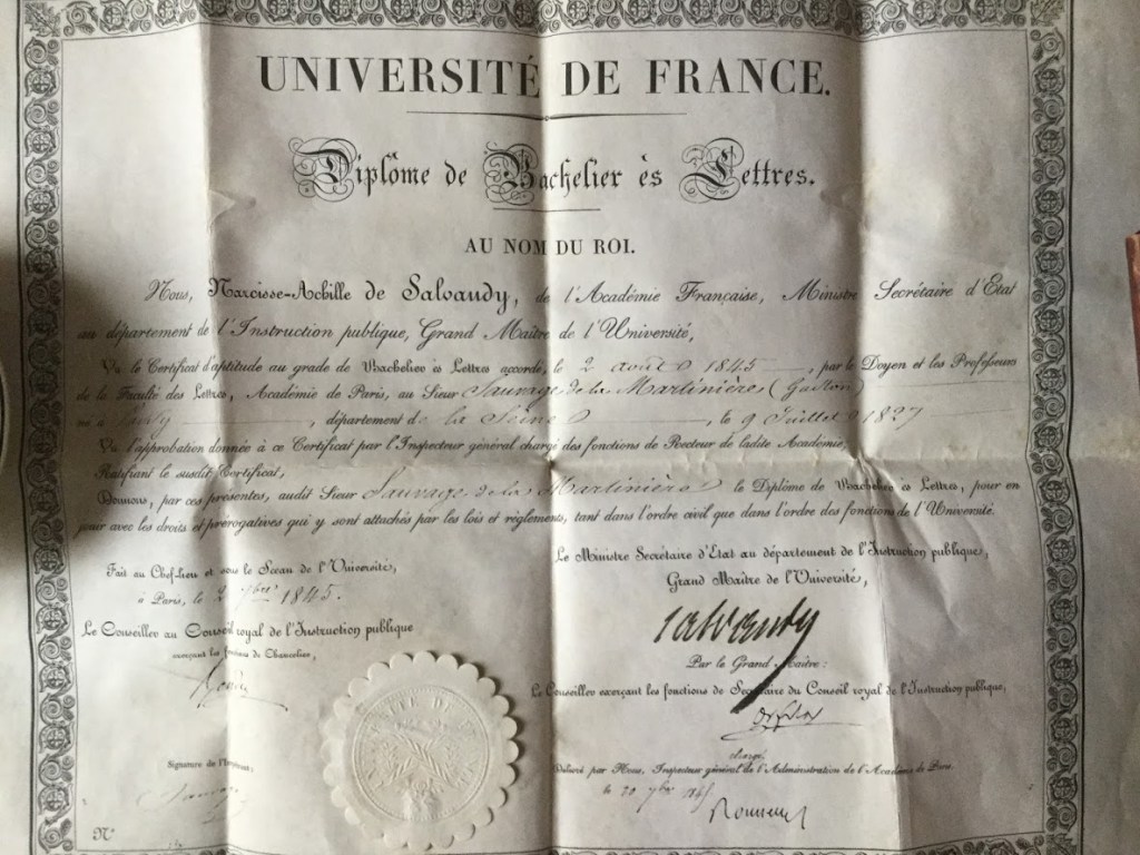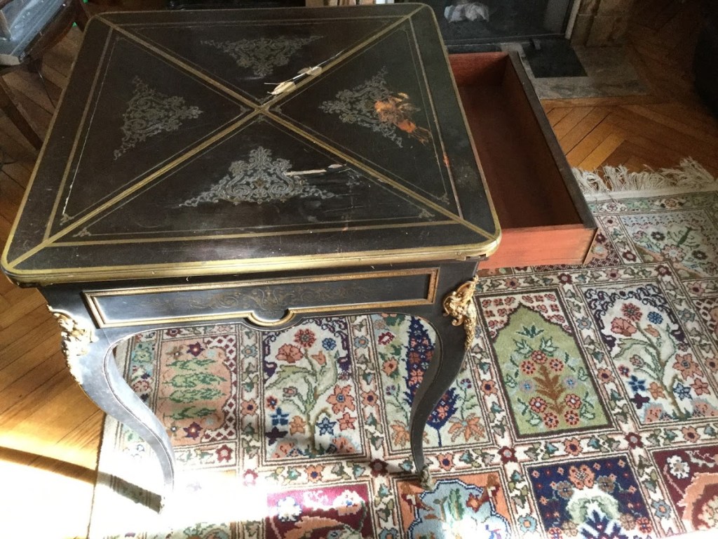 En 2021, Vladimir Souchko, ébéniste rouennais a réalisé un travail remarquable qui lui a redonné son lustre d’antan, et devinez quoi un tiroir fermé à clef dont la clef était perdue a livré le diplôme du bac du grand-père de ma grand-mère maternelle (1845 diplôme universitaire).